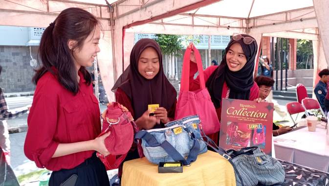 “Kami bertiga ini mengambil mata kuliah kewirausahaan, jadi barang bekas celana jeans dijadikan kreasi tas yang unik. Satu tas bisa selesai satu minggu, karena ini homemade dan waktu luangnya yang susah. Ini dijual Rp 50 sampai Rp 100 ribu,” pungkasnya. (aci)