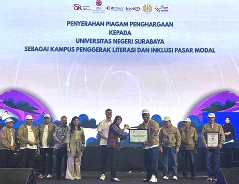 Penghargaan kepada Unesa diserahkan secara resmi di Grha Unesa Surabaya oleh Kepala Otoritas Jasa Keuangan (OJK) Jawa Timur Yunita Linda Sari, didampingi Kepala Wilayah Kantor Perwakilan BEI Jawa Timur Cita Mellisa kepada Rektor Unesa Prof Dr Nurhasan MKes, Senin (25/8/2025).