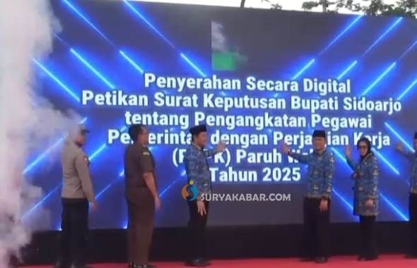 SIDOARJO, SURYAKABAR.com – Setelah lama menunggu, 3.862 Pegawai Pemerintah dengan Perjanjian Kerja (PPPK) Paruh Waktu menerima petikan SK Pengangkatan dari Bupati Sidoarjo, Subandi. Prosesi pemberian SK tersebut digelar secara digital di Parkir Timur GOR Sidoarjo, Senin (17/11/2025) pagi.