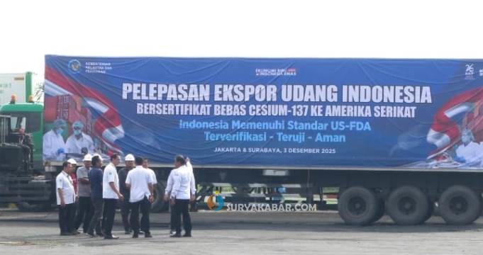 Keberhasilan ini ditandai dengan pelepasan ekspor udang bersertifikat bebas radionuklida ke Negeri Paman Sam melalui pelabuhan di Jakarta dan Sidoarjo, Rabu (3/12/2025).