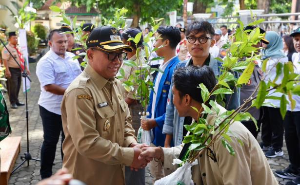 Sebanyak 2.026 bibit pohon dibagikan kepada para pengendara roda dua dan roda empat yang melintas di depan Kantor Perhutani, Jalan Jaksa Agung Suprapto.